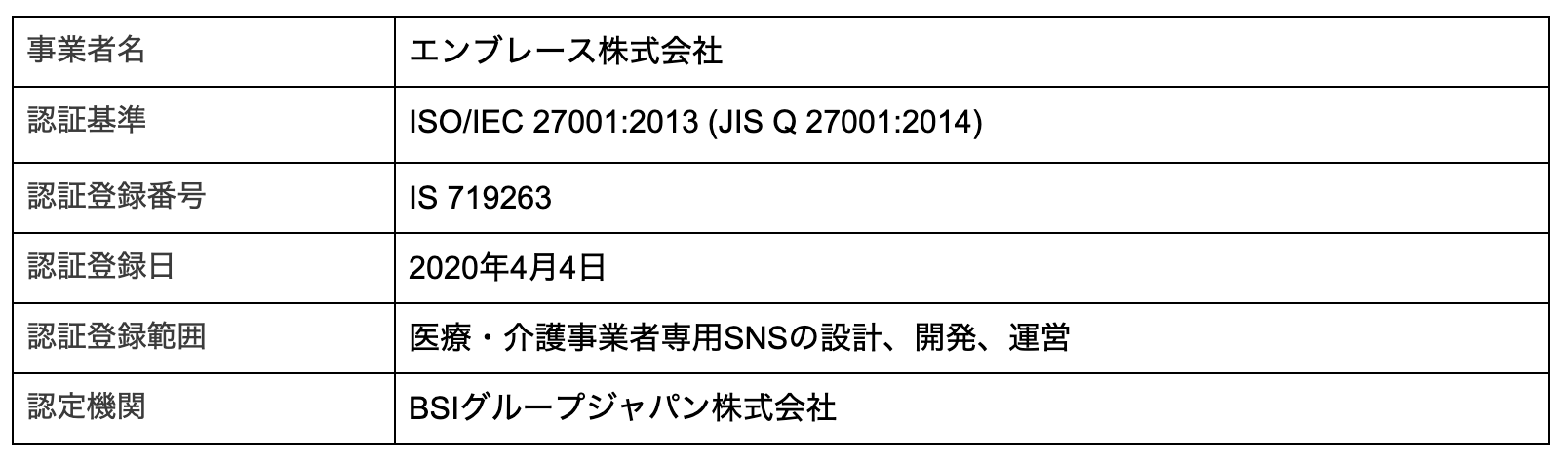 非公開型医療介護連携SNS「メディカルケアステーション(以下、MCS)」を運営するエンブレース株式会社(本社:東京都港区、代表取締役社長:松下和彦、以下エンブレース)は、情報セキュリティマネジメントシステム(ISMS)の 国際規格であるISO/IEC 27001:2013 (JIS Q 27001:2014)の認証を、4月4日付で取得いたしました。