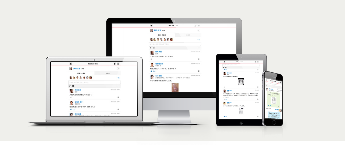 「メディカルケアステーション (MCS)」は、誰でも簡単に利用できるタイムライン形式による非公開型医療介護連携SNSで、タブレット、スマートフォン、パソコンなど多様な端末に対応しています。強固なセキュリティのもとで院内や施設内はもちろん、外出先からでも必要な情報へ簡単にアクセスし、共有が可能。医師やコメディカル、介護職、患者さんとそのご家族が職種や立場を超えてつながる地域包括ケア・多職種連携を実現します。